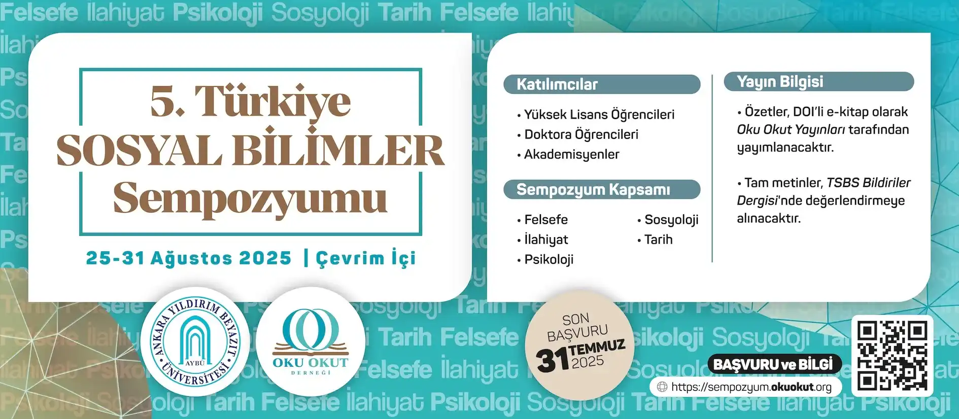 Türkiye Türkiye Sosyal Bilimler Sempozyumu, 2021 yılından bu yana Ankara Yıldırım Beyazıt Üniversitesi ile Oku Okut Derneği iş birliğinde, sosyal bilimler alanındaki akademik etkileşimi artırmak ve tecrübe paylaşımına imkân sağlamak amacıyla çevrim içi olarak düzenlenmektedir. Bu yıl sempozyuma felsefe, ilahiyat, psikoloji, sosyoloji ve tarih alanlarından başvurular alınmıştır. Bu kapsamda 127 başvuru değerlendirmeye alınmış; yoğun inceleme sürecinin ardından 86 bildiri, yani başvuruların %67,72’si kabul edilmiştir. 25–31 Ağustos 2025 tarihlerinde çevrim içi olarak gerçekleştirilen sempozyumda, çift yazarlı çalışmalarla birlikte 28 kurumdan 100 araştırmacı sunum yapmış; toplamda 60 üniversite ve kurumdan 202 araştırmacı katkı sunmuştur. Ayrıca sürecin nitelikli yürütülmesi için 25 kurumdan 58 Bilim Kurulu üyesi görev almış; sempozyum 7 gün boyunca 32 oturum hâlinde gerçekleştirilmiştir.